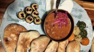 ジョージア伝統のショーティ・パン(塩気のある窯焼きパン)、ロビオ(赤インゲン豆をスパイスで煮たシチュー的なもの)といった、ハーブやクルミを多く使ったジョージアらしい前菜が並びます。