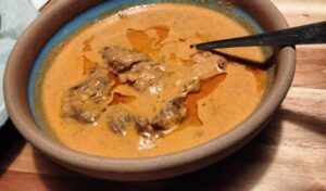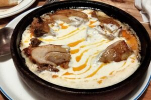 「世界一にんにくをおいしく食べるための料理」とも称されるシュクメルリですが、今回のものは思ったより優しいお味。ミルクベースのソースが全体をまとめていて、にんにくが苦手な方でも試しやすいバランスでした。